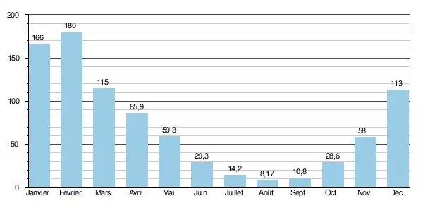 Le régime du bassin est de type pluvial océanique. Le graphique suivant recense le débit moyen mensuel de la Vilaine (en m³/s) mesuré entre 1970 et 2000 à Rieux, quelques kilomètres avant l'embouchure du fleuve[3].