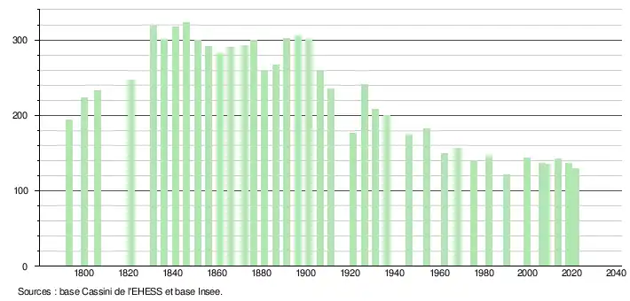 L'évolution du nombre d'habitants est connue à travers les recensements de la population effectués dans la commune depuis 1793. Pour les communes de moins de 10 000 habitants, une enquête de recensement portant sur toute la population est réalisée tous les cinq ans, les populations légales des années intermédiaires étant quant à elles estimées par interpolation ou extrapolation[22]. Pour la commune, le premier recensement exhaustif entrant dans le cadre du nouveau dispositif a été réalisé en 2008[23].