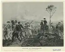 Lorsque l'attaque commença vers 15h, les positions allemandes furent immédiatement encerclées par les coups de feu. Stark décrivit l'engagement en ces termes : « [c'est] le plus fort que j'ai jamais vu, il ressemble à un coup de tonnerre continu »[T 4],[30]. Les Loyalistes et les Amérindiens étaient dépassés, ce qui poussa la plupart d'entre eux à s'enfuir ou à se rendre. Dans ce contexte, Baum et ses dragons de Brunswick étaient piégés, seuls, sur une hauteur. Les Allemands combattirent vaillamment, même après avoir perdu la majeure partie de leurs munitions, leur wagon ayant été détruit. Désespérés, ils menèrent une charge au sabre dans une tentative visant à percer les Américains qui les encerclaient. Baum fut mortellement blessé dans cette charge finale, et les Allemands survivants se rendirent[29].