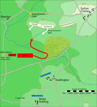 Richard rejoint Norfolk à Leicester le 20 août, et Northumberland arrive le lendemain. L'armée royale se met en marche vers l'ouest pour couper la marche d'Henri vers Londres. Passé Sutton Cheney, Richard dirige son armée vers Ambion Hill (en), estimant qu'elle pourrait avoir une importance tactique, et y établit son camp[87]. Son sommeil est agité ; selon la Chronique de Croyland, au matin son visage est « plus livide et effroyable qu'à l'ordinaire[88] ».
