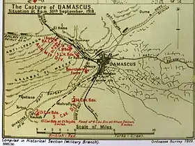 - (en) Cet article est partiellement ou en totalité issu de l’article de Wikipédia en anglais intitulé « Capture of Damascus (1918) » (voir la liste des auteurs) dans sa version du 9 mai 2018.