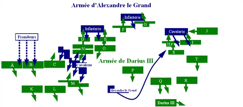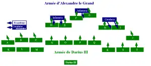 - Pour l'ordre de bataille des troupes macédoniennes voir Diodore, XVII, 57 ; Arrien, III, 5.