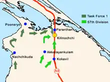 Le , la 57e division prend Akkarayankulam au sud de la ville[5]. La jonction de Iranamadu est aussi prise par l'armée[6]. Plus à l'ouest, le 1er corps expéditionnaire (devenue ensuite la 58e division) s'empare de Pooneryn[7] () puis de Paranthan () alors que la bataille fait rage autour de Kilinochchi[8]. Ce mouvement permettra de menacer la ville par le nord et provoquera rapidement son évacuation.