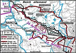 Le , Joffre précise à la 1re armée du général Dubail son axe principal d’offensive en Lorraine au départ de Baccarat sur la Meurthe. Un axe de direction du sud-ouest vers le nord-est sur 40 km jusqu’à Sarrebourg puis de direction sud-nord sur 42 km jusqu’à Sarreguemines avec une pénétration de 55 km en Moselle allemande[11]. Axe que ceux de la 1re armée de Dubail auront tendance à transformer en limite ouest aux dépens de la 2e armée et notamment de ses 15e et 16e corps.