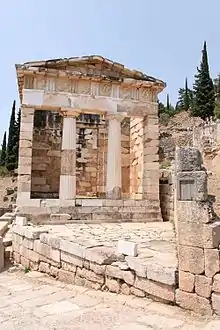 Vers 485 av. J.-C., Athènes fait ériger à Delphes un temple commémoratif, le Trésor des Athéniens, sur la pente qui mène au temple d'Apollon. Plus tard, des représentations de la bataille sont réalisées à Athènes : Pausanias mentionne une peinture de celle-ci sur un portique de l'agora[87], et il est possible que le relief représentant un combat entre Grecs et Perses sur le côté sud du temple d'Athéna Niké de l'Acropole présente cette bataille[88]. Une inscription grecque, retrouvée dans les possessions d'Hérode Atticus commémorait la bataille, et indiquait la liste des soldats tombés au combat[89].