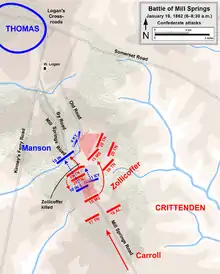 Le général de brigade unioniste George H. Thomas reçut l'ordre de faire traverser ses forces sur la rivière Cumberland et de briser l'armée de Crittenden. Thomas quitta Lebanon et avança lentement à travers un terrain détrempé, n'atteignant ainsi Logan's Crossroads que le , où il attendit les troupes du général de brigade Albin F. Schoepf en provenance de Somerset pour se joindre à lui. Crittenden, resté jusqu'à début janvier dans son quartier général basé à Knoxville, arriva finalement à Mill Springs et réalisa alors que son subordonné inexpérimenté se trouvait dans une dangereuse situation. Il conçut un plan pour attaquer les forces de l'Union avant que celles-ci ne se regroupent pour attaquer; une section de l'armée unioniste et trois brigades sous le commandement de Thomas, étaient situées à Logan's Crossroads; la brigade de Schoepf était quant à elle basée à Somerset, séparée par le Fishing Creek, alors en crue à cause de la pluie, ce qui pouvait constituer une barrière suffisante pour empêcher ces diverses forces armées de faire rapidement leur jonction. Crittenden ordonna à Zollicoffer d'attaquer dès l'aube du 19 janvier le camp de l'Union à Logan's Crossroads[5].