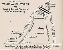 Le lieu de la bataille n'est pas connu, et pas moins de trente-huit sites sont avancés comme lieu exact de la bataille[31]. Selon Carpentier, « On sait seulement que Charles Martel a remporté quelque part entre Poitiers et Tours, sur le territoire de Poitiers, un combat »[32].