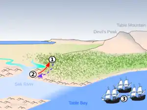 Une force d'environ 170 Khoïkhoïs contre-attaque avec des pierres, des lances à pointe de bois durci au feu et des flèches empoisonnées. Les Khoïkhoïs déploient également du bétail spécialement entraîné qui répond à des sifflets et des cris spécifiques [1]. Lorsque les armes des Khoïkhoïs se révèlent inefficaces contre les Portugais, ils utilisent leur bétail comme boucliers mobiles, se cachant derrière eux, et en lançant avec précision des lances et des pierres sur les Portugais, les forçant à se retirer sur la plage de ce qui fait aujourd'hui partie de Salt River, près du Cap [1],[4].