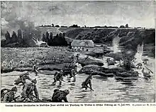La deuxième moitié du mois de juin et la première moitié du mois de juillet se sont déroulées sans événements particuliers. Le 14 juillet, l'attaque prévue de longue date du côté allemand commence. L'aile gauche est entrée en action : Détachement Libau (trois bataillons), 8e division de cavalerie, corps de cavalerie "Schmettow", 41e division d'infanterie 6 et 78e division de réserve. Les trois dernières divisions forment le corps du Nord sous le commandement du général Lauenstein, tandis que le 1er corps de réserve, composé de la 1re division de réserve, doit atteindre la ville au nord avec le renfort de la brigade "Homeyer". Elle doit enchaîner l'ennemi et prendre la forte position de Schaulen. Le groupe sud, composé de la 80e division de réserve, de la 36e division de réserve, du détachement "Esebeck" et du 1er haut commandement de cavalerie (de) ne doivent pas dépasser la Dubissa. Après que deux mortiers de 21 cm avec trois batteries d'obusiers lourds et trois batteries d'obusiers légers prennent d'assaut la position russe, celle-ci est prise d'assaut à 3h30 par le 18e régiment de réserve. Le 21 juillet, la lisière sud de Lepary et Gigary est atteinte et à 4 heures du matin, les premières troupes du régiment de réserve Königsberg II, qui deviendra le 378e régiment d'infanterie, pénétrent dans la ville. Il est suivi par le 2e régiment de grenadiers et le 8e bataillon de remplacement. La 1re division de réserve a en revanche repoussé l'ennemi qui se trouve devant elle et traverse la forêt au nord-ouest de Schaulen. Malgré de lourdes pertes, l'ennemi se présente encore une fois sur les hauteurs à l'est de Schaulen. Mais il est définitivement jeté dans la soirée du 21 juillet par une attaque d'encerclement du régiment de réserve Königsberg II et du 2e régiment de grenadiers. Alors que le premier jour de combat a été clair et ensoleillé, une forte pluie de terre s'abat le 21 juillet. Malgré cela, la poursuite de l'ennemi vaincu est entreprise de manière conséquente. Le 28 juillet 1915, le quartier général du haut commandement de l'armée du Niémen est établi dans la ville conquise de Schaulen[5].