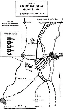 La garnison a l'ordre de tenir la ville à tout prix, tandis qu'une force de secours est organisée. Le reste de la 83e division d'infanterie et de la 3e division de montagne, encerclée au sud de Velikié Louki, attaque vers l'ouest pour rétablir la ligne de front antérieure. Plus tard, d'autres divisions sont engagées, dont la 8e division de Panzer, la 20e division d'infanterie motorisée de réserve et la 6e division de terrain de la Luftwaffe et les 205e et 331e divisions d'infanterie.