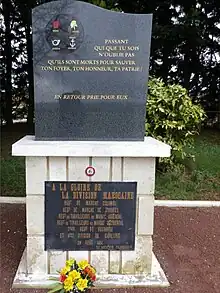 « Ce fut le à la Fosse-à-l'Eau. L'ennemi débouchait de la forêt de Signy-l'Abbaye ; ordre fut donné à la Division d'arrêter sa marche. Alors zouaves et tirailleurs - en larges culottes blanches, ceinture bleue ou rouge, chéchia écarlate, - chargèrent l'ennemi, comme ils avaient l'habitude de le faire au Maroc, loyalement à découvert, les officiers en tête. Et si impétueux fut leur élan, si héroïque leur charge que l'ennemi plia et que la première rencontre fut une première victoire. Lorsque dans la nuit, sur ordre, la Division quitta la Fosse-à-l'Eau, l'ennemi n'osa pas la poursuivre et ce n'est que le lendemain, tard dans la matinée, que les Allemands lancèrent leurs colonnes d'assaut sur les ruines du village de Launoy. Le choc avait été rude, sabre à la main, chargeant héroïquement à la tête de leurs bataillons, les commandants Clerc, Britsch, Mignerot et Sauvageot étaient tombés. Le capitaine Muller, mortellement atteint, passe à un tirailleur les papiers de sa compagnie ; celui-ci tend la main droite, une balle lui brise le poignet ; alors tranquillement le tirailleur prend de la main gauche les papiers précieux, et va les porter à son lieutenant avant de songer à se faire panser. L'artillerie avait pris à la lutte une part active ; jusque sur les crêtes de la Fosse-à-l'Eau, ses batteries étaient venues se mettre en position, presque mêlées aux premières lignes d'infanterie. »