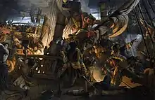 Le corsaire dunkerquois donne l'ordre de l'abordage. Il se réserve le commandement du Maure, et l'abordage du Prince de Frise. Cela tombe bien, car le navire amiral fait manœuvre vers le Maure, indice que de Vries s'est réservé Jean Bart. Il ne faut donc guère s'attendre à la fréquente reddition sans combat qui suit les abordages. Il s'agit d'une mission régulière et non d'une affaire de caprerie. Jean Bart s'attend donc à être payé par le roi quand le roi aura de l'argent, et il en a rarement.