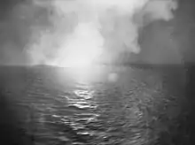 Mais à 9 h 38, jailli d'un nuage, un bombardier Judy (il sera abattu peu après par deux Hellcats)[89] place une bombe de 250 kg sur l'USS Princeton. L'impact provoque un incendie qui fait exploser dans le hangar des avions aux réservoirs de carburant pleins et prêts à être hissés sur le pont d'envol[90]. À 10 h, le porte-avions est secoué par une violente explosion. Les équipes de sécurité vont s'affairer toute la matinée et une partie de l'équipage est évacuée. Croiseurs et destroyers se portent au secours du navire immobilisé, tandis qu'une nouvelle attaque aérienne japonaise est repoussée par la chasse embarquée des USS Essex et Langley. Les pertes de l'aviation japonaise ont été très importantes, le contre-amiral Sherman les a estimées à 120 appareils, mais il n'est plus possible au TG 38.3 de faire mouvement[91].