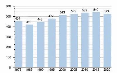 Battincourt compte 524 habitants au . Le graphique suivant représente l'évolution du nombre d'habitants du village depuis le premier recensement de la commune d'Aubange après la fusion des communes, soit en 1978[4]: