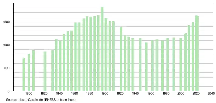 L'évolution du nombre d'habitants est connue à travers les recensements de la population effectués dans la commune depuis 1793. Pour les communes de moins de 10 000 habitants, une enquête de recensement portant sur toute la population est réalisée tous les cinq ans, les populations légales des années intermédiaires étant quant à elles estimées par interpolation ou extrapolation[35]. Pour la commune, le premier recensement exhaustif entrant dans le cadre du nouveau dispositif a été réalisé en 2005[36].