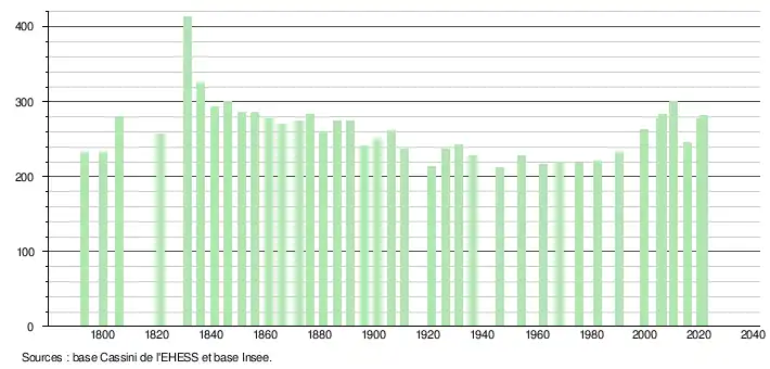 L'évolution du nombre d'habitants est connue à travers les recensements de la population effectués dans la commune depuis 1793. Pour les communes de moins de 10 000 habitants, une enquête de recensement portant sur toute la population est réalisée tous les cinq ans, les populations légales des années intermédiaires étant quant à elles estimées par interpolation ou extrapolation[20]. Pour la commune, le premier recensement exhaustif entrant dans le cadre du nouveau dispositif a été réalisé en 2005[21].