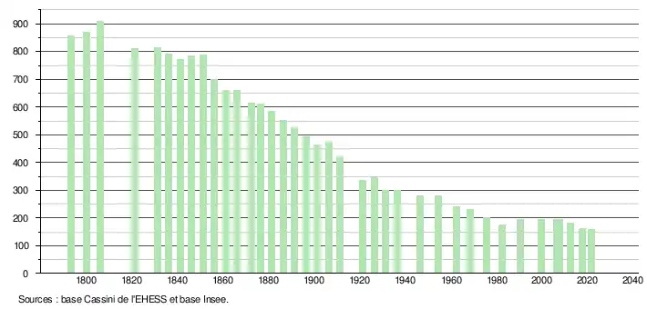 L'évolution du nombre d'habitants est connue à travers les recensements de la population effectués dans la commune depuis 1793. Pour les communes de moins de 10 000 habitants, une enquête de recensement portant sur toute la population est réalisée tous les cinq ans, les populations légales des années intermédiaires étant quant à elles estimées par interpolation ou extrapolation[23]. Pour la commune, le premier recensement exhaustif entrant dans le cadre du nouveau dispositif a été réalisé en 2007[24].