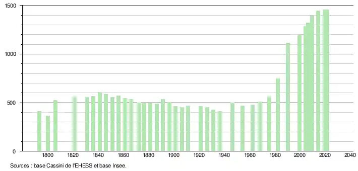 L'évolution du nombre d'habitants est connue à travers les recensements de la population effectués dans la commune depuis 1793. Pour les communes de moins de 10 000 habitants, une enquête de recensement portant sur toute la population est réalisée tous les cinq ans, les populations légales des années intermédiaires étant quant à elles estimées par interpolation ou extrapolation[28]. Pour la commune, le premier recensement exhaustif entrant dans le cadre du nouveau dispositif a été réalisé en 2004[29].