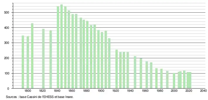 | L'évolution du nombre d'habitants est connue à travers les recensements de la population effectués dans la commune depuis 1793. Pour les communes de moins de 10 000 habitants, une enquête de recensement portant sur toute la population est réalisée tous les cinq ans, les populations légales des années intermédiaires étant quant à elles estimées par interpolation ou extrapolation[23]. Pour la commune, le premier recensement exhaustif entrant dans le cadre du nouveau dispositif a été réalisé en 2008[24]. En 2021, la commune comptait 108 habitants[Note 3], en diminution de 10,74 % par rapport à 2015 (Gers : +0,79 %, France hors Mayotte : +1,84 %). |
