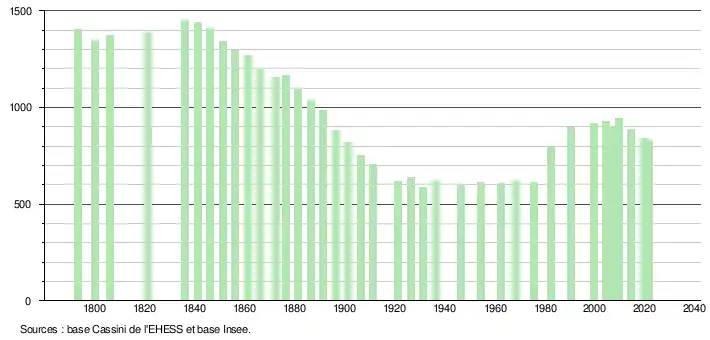 L'évolution du nombre d'habitants est connue à travers les recensements de la population effectués dans la commune depuis 1793. Pour les communes de moins de 10 000 habitants, une enquête de recensement portant sur toute la population est réalisée tous les cinq ans, les populations légales des années intermédiaires étant quant à elles estimées par interpolation ou extrapolation[22]. Pour la commune, le premier recensement exhaustif entrant dans le cadre du nouveau dispositif a été réalisé en 2004[23].