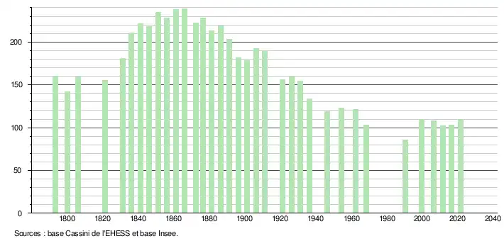 L'évolution du nombre d'habitants est connue à travers les recensements de la population effectués dans la commune depuis 1793. Pour les communes de moins de 10 000 habitants, une enquête de recensement portant sur toute la population est réalisée tous les cinq ans, les populations légales des années intermédiaires étant quant à elles estimées par interpolation ou extrapolation[14]. Pour la commune, le premier recensement exhaustif entrant dans le cadre du nouveau dispositif a été réalisé en 2006[15].