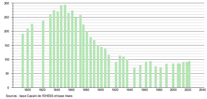 L'évolution du nombre d'habitants est connue à travers les recensements de la population effectués dans la commune depuis 1793. Pour les communes de moins de 10 000 habitants, une enquête de recensement portant sur toute la population est réalisée tous les cinq ans, les populations légales des années intermédiaires étant quant à elles estimées par interpolation ou extrapolation[18]. Pour la commune, le premier recensement exhaustif entrant dans le cadre du nouveau dispositif a été réalisé en 2008[19].
