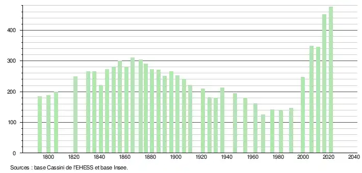 | L'évolution du nombre d'habitants est connue à travers les recensements de la population effectués dans la commune depuis 1793. Pour les communes de moins de 10 000 habitants, une enquête de recensement portant sur toute la population est réalisée tous les cinq ans, les populations légales des années intermédiaires étant quant à elles estimées par interpolation ou extrapolation[29]. Pour la commune, le premier recensement exhaustif entrant dans le cadre du nouveau dispositif a été réalisé en 2006[30]. En 2021, la commune comptait 476 habitants[Note 4], en augmentation de 13,6 % par rapport à 2015 (Haute-Garonne : +7,43 %, France hors Mayotte : +1,84 %). |