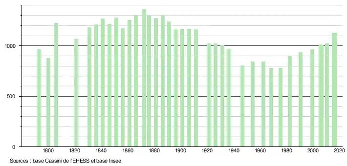 L'évolution du nombre d'habitants est connue à travers les recensements de la population effectués dans la commune depuis 1793. Pour les communes de moins de 10 000 habitants, une enquête de recensement portant sur toute la population est réalisée tous les cinq ans, les populations légales des années intermédiaires étant quant à elles estimées par interpolation ou extrapolation[4]. Pour la commune, le premier recensement exhaustif entrant dans le cadre du nouveau dispositif a été réalisé en 2005[5].