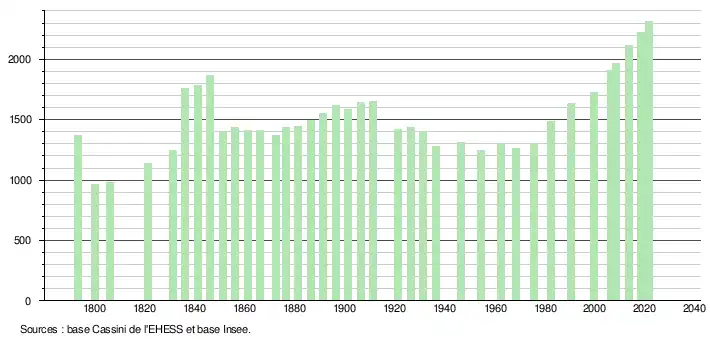 L'évolution du nombre d'habitants est connue à travers les recensements de la population effectués dans la commune depuis 1793. Pour les communes de moins de 10 000 habitants, une enquête de recensement portant sur toute la population est réalisée tous les cinq ans, les populations légales des années intermédiaires étant quant à elles estimées par interpolation ou extrapolation[25]. Pour la commune, le premier recensement exhaustif entrant dans le cadre du nouveau dispositif a été réalisé en 2008[26].