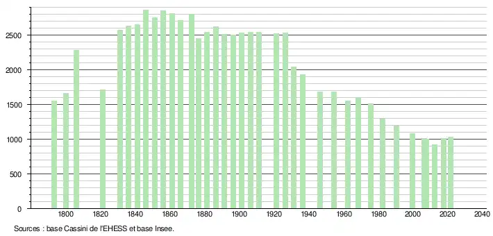 L'évolution du nombre d'habitants est connue à travers les recensements de la population effectués dans la commune depuis 1793. Pour les communes de moins de 10 000 habitants, une enquête de recensement portant sur toute la population est réalisée tous les cinq ans, les populations légales des années intermédiaires étant quant à elles estimées par interpolation ou extrapolation[31]. Pour la commune, le premier recensement exhaustif entrant dans le cadre du nouveau dispositif a été réalisé en 2007[32].