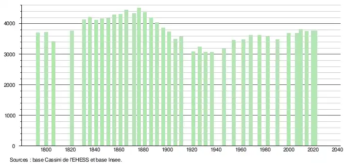 - Population municipale légale en vigueur au 1er janvier 2024, millésimée 2021, définie dans les limites territoriales en vigueur au 1er janvier 2023, date de référence statistique : 1er janvier 2021.
