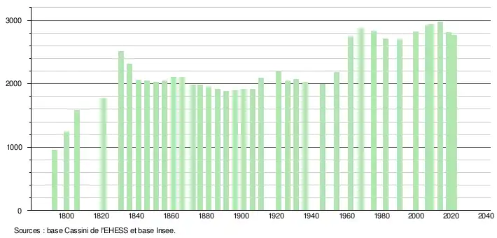 L'évolution du nombre d'habitants est connue à travers les recensements de la population effectués dans la commune depuis 1793. Pour les communes de moins de 10 000 habitants, une enquête de recensement portant sur toute la population est réalisée tous les cinq ans, les populations légales des années intermédiaires étant quant à elles estimées par interpolation ou extrapolation[37]. Pour la commune, le premier recensement exhaustif entrant dans le cadre du nouveau dispositif a été réalisé en 2008[38].