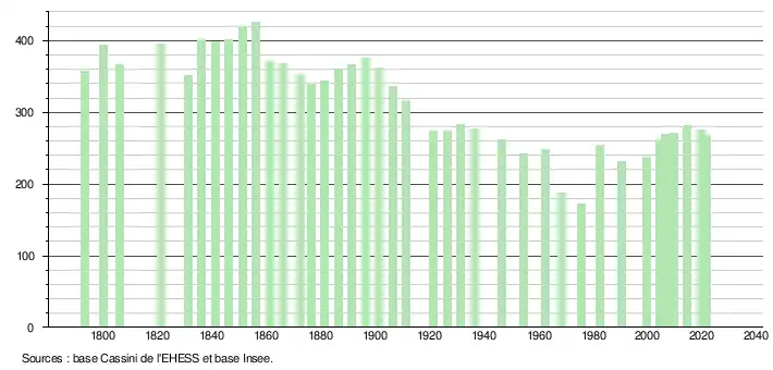 L'évolution du nombre d'habitants est connue à travers les recensements de la population effectués dans la commune depuis 1793. Pour les communes de moins de 10 000 habitants, une enquête de recensement portant sur toute la population est réalisée tous les cinq ans, les populations légales des années intermédiaires étant quant à elles estimées par interpolation ou extrapolation[23]. Pour la commune, le premier recensement exhaustif entrant dans le cadre du nouveau dispositif a été réalisé en 2004[24].