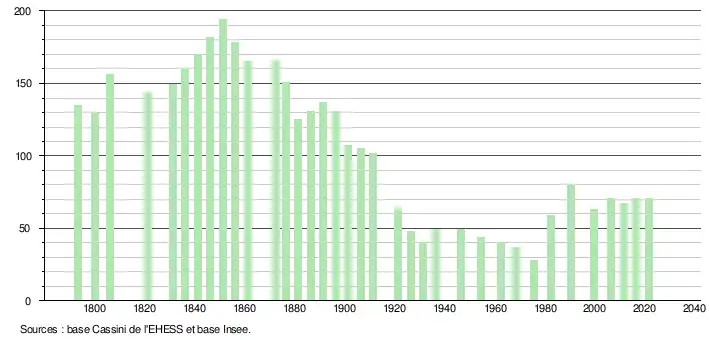 L'évolution du nombre d'habitants est connue à travers les recensements de la population effectués dans la commune depuis 1793. Pour les communes de moins de 10 000 habitants, une enquête de recensement portant sur toute la population est réalisée tous les cinq ans, les populations légales des années intermédiaires étant quant à elles estimées par interpolation ou extrapolation[23]. Pour la commune, le premier recensement exhaustif entrant dans le cadre du nouveau dispositif a été réalisé en 2006[24].