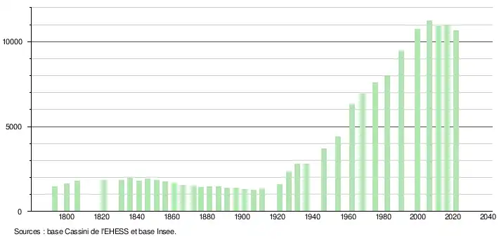 - Par convention dans Wikipédia, le principe a été retenu de n’afficher dans le tableau des recensements et le graphique, pour les populations légales postérieures à 1999, que les populations correspondant à une enquête exhaustive de recensement pour les communes de moins de 10 000 habitants, et que les populations des années 2006, 2011, 2016, etc. pour les communes de plus de 10 000 habitants, ainsi que la dernière population légale publiée par l’Insee pour l'ensemble des communes.