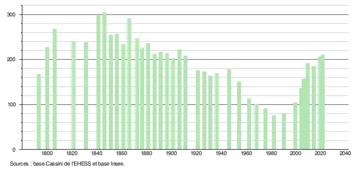 L'évolution du nombre d'habitants est connue à travers les recensements de la population effectués dans la commune depuis 1793. Pour les communes de moins de 10 000 habitants, une enquête de recensement portant sur toute la population est réalisée tous les cinq ans, les populations légales des années intermédiaires étant quant à elles estimées par interpolation ou extrapolation[26]. Pour la commune, le premier recensement exhaustif entrant dans le cadre du nouveau dispositif a été réalisé en 2004[27].