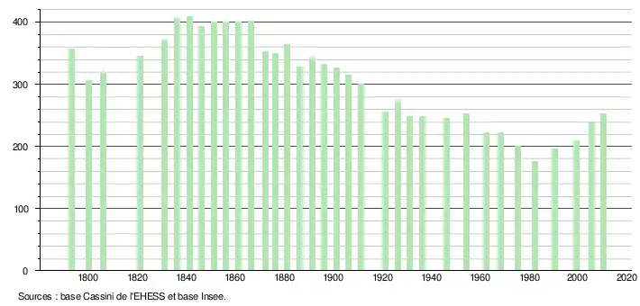 L'évolution du nombre d'habitants est connue à travers les recensements de la population effectués dans la commune depuis 1793. À partir du , les populations légales des communes sont publiées annuellement dans le cadre d'un recensement qui repose désormais sur une collecte d'information annuelle, concernant successivement tous les territoires communaux au cours d'une période de cinq ans. Pour les communes de moins de 10 000 habitants, une enquête de recensement portant sur toute la population est réalisée tous les cinq ans, les populations légales des années intermédiaires étant quant à elles estimées par interpolation ou extrapolation[7]. Pour la commune, le premier recensement exhaustif entrant dans le cadre du nouveau dispositif a été réalisé en 2005[8],[Note 1].