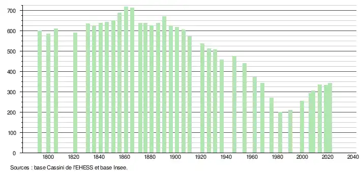L'évolution du nombre d'habitants est connue à travers les recensements de la population effectués dans la commune depuis 1793. Pour les communes de moins de 10 000 habitants, une enquête de recensement portant sur toute la population est réalisée tous les cinq ans, les populations légales des années intermédiaires étant quant à elles estimées par interpolation ou extrapolation[26]. Pour la commune, le premier recensement exhaustif entrant dans le cadre du nouveau dispositif a été réalisé en 2008[27].