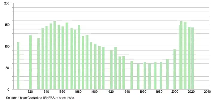 L'évolution du nombre d'habitants est connue à travers les recensements de la population effectués dans la commune depuis 1806. Pour les communes de moins de 10 000 habitants, une enquête de recensement portant sur toute la population est réalisée tous les cinq ans, les populations légales des années intermédiaires étant quant à elles estimées par interpolation ou extrapolation[21]. Pour la commune, le premier recensement exhaustif entrant dans le cadre du nouveau dispositif a été réalisé en 2007[22].