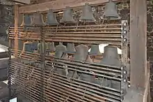 En 1765, le beffroi possédait quatre grosses cloches. Celles-ci furent refondues à l'initiative du Magistrat, ce qui entraina un conflit entre celui-ci et le Chapitre de la collégiale qui refusa de partager les frais[15]. Le Magistrat dut dont supporter seul le coût de la fonte commandées, en 1763 à Levache et, en 1765 et 1766, à Pierre Monaux de Givet[16]. Les deux cloches fondues par Monaux se trouvent toujours dans le beffroi. Il s'agit de la Paula, de 1765[alpha 5], et de la Maria, fondue en 1766[alpha 6].