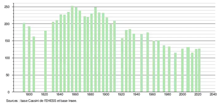 L'évolution du nombre d'habitants est connue à travers les recensements de la population effectués dans la commune depuis 1793. Pour les communes de moins de 10 000 habitants, une enquête de recensement portant sur toute la population est réalisée tous les cinq ans, les populations légales des années intermédiaires étant quant à elles estimées par interpolation ou extrapolation[29]. Pour la commune, le premier recensement exhaustif entrant dans le cadre du nouveau dispositif a été réalisé en 2007[30].