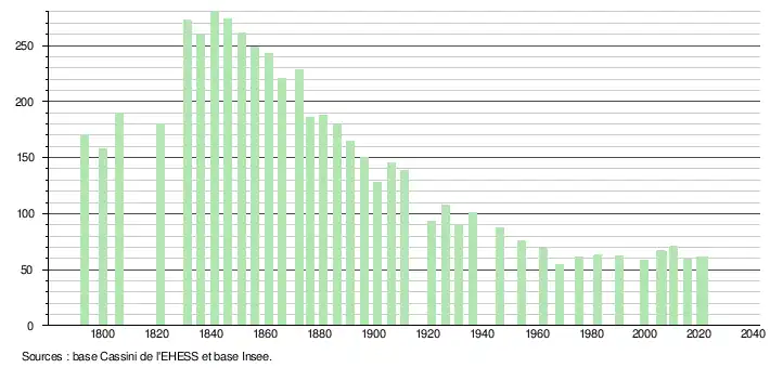 L'évolution du nombre d'habitants est connue à travers les recensements de la population effectués dans la commune depuis 1793. Pour les communes de moins de 10 000 habitants, une enquête de recensement portant sur toute la population est réalisée tous les cinq ans, les populations légales des années intermédiaires étant quant à elles estimées par interpolation ou extrapolation[28]. Pour la commune, le premier recensement exhaustif entrant dans le cadre du nouveau dispositif a été réalisé en 2005[29].