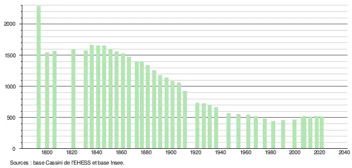 | L'évolution du nombre d'habitants est connue à travers les recensements de la population effectués dans la commune depuis 1793. Pour les communes de moins de 10 000 habitants, une enquête de recensement portant sur toute la population est réalisée tous les cinq ans, les populations légales des années intermédiaires étant quant à elles estimées par interpolation ou extrapolation[34]. Pour la commune, le premier recensement exhaustif entrant dans le cadre du nouveau dispositif a été réalisé en 2007[35]. En 2021, la commune comptait 511 habitants[Note 4], en augmentation de 1,19 % par rapport à 2015 (Lot : +0,89 %, France hors Mayotte : +1,84 %). |