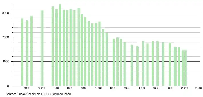 L'évolution du nombre d'habitants est connue à travers les recensements de la population effectués dans la commune depuis 1793. Pour les communes de moins de 10 000 habitants, une enquête de recensement portant sur toute la population est réalisée tous les cinq ans, les populations légales des années intermédiaires étant quant à elles estimées par interpolation ou extrapolation[29]. Pour la commune, le premier recensement exhaustif entrant dans le cadre du nouveau dispositif a été réalisé en 2007[30].