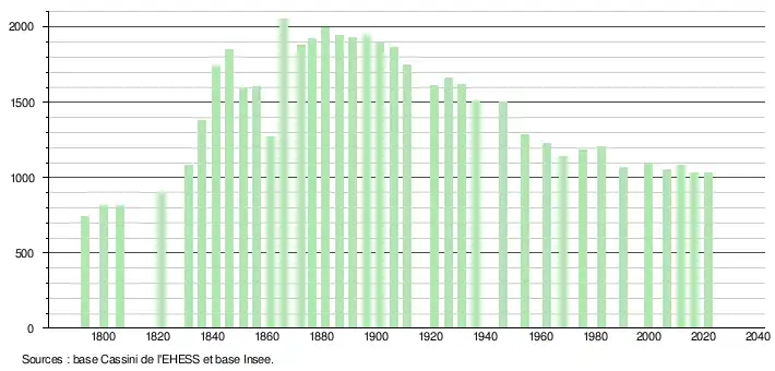 L'évolution du nombre d'habitants est connue à travers les recensements de la population effectués dans la commune depuis 1793. Pour les communes de moins de 10 000 habitants, une enquête de recensement portant sur toute la population est réalisée tous les cinq ans, les populations légales des années intermédiaires étant quant à elles estimées par interpolation ou extrapolation[27]. Pour la commune, le premier recensement exhaustif entrant dans le cadre du nouveau dispositif a été réalisé en 2006[28].
