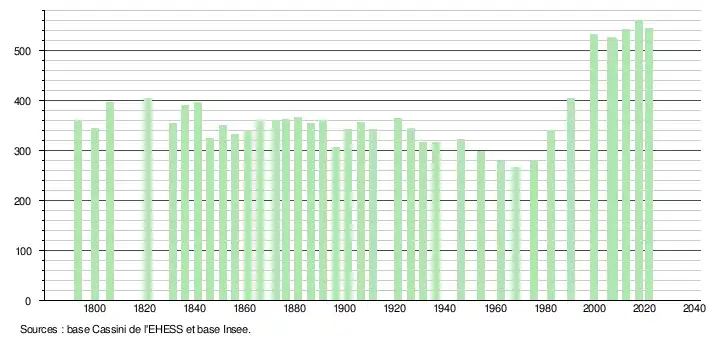 L'évolution du nombre d'habitants est connue à travers les recensements de la population effectués dans la commune depuis 1793. Pour les communes de moins de 10 000 habitants, une enquête de recensement portant sur toute la population est réalisée tous les cinq ans, les populations légales des années intermédiaires étant quant à elles estimées par interpolation ou extrapolation[50]. Pour la commune, le premier recensement exhaustif entrant dans le cadre du nouveau dispositif a été réalisé en 2007[51].