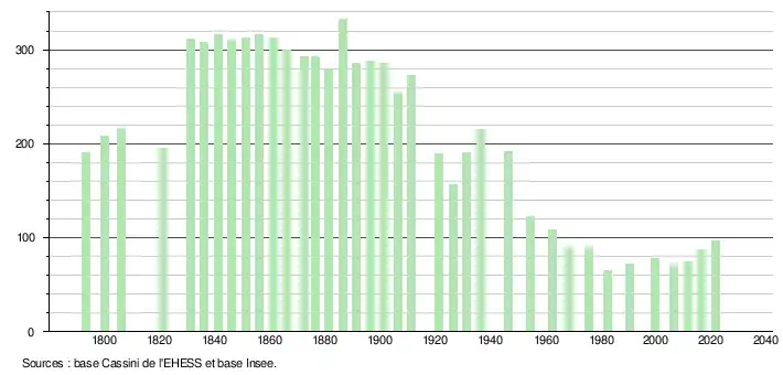 L'évolution du nombre d'habitants est connue à travers les recensements de la population effectués dans la commune depuis 1793. Pour les communes de moins de 10 000 habitants, une enquête de recensement portant sur toute la population est réalisée tous les cinq ans, les populations légales des années intermédiaires étant quant à elles estimées par interpolation ou extrapolation[27]. Pour la commune, le premier recensement exhaustif entrant dans le cadre du nouveau dispositif a été réalisé en 2006[28].