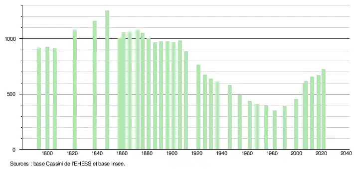 L'évolution du nombre d'habitants est connue à travers les recensements de la population effectués dans la commune depuis 1793. Pour les communes de moins de 10 000 habitants, une enquête de recensement portant sur toute la population est réalisée tous les cinq ans, les populations légales des années intermédiaires étant quant à elles estimées par interpolation ou extrapolation[21]. Pour la commune, le premier recensement exhaustif entrant dans le cadre du nouveau dispositif a été réalisé en 2007[22].
