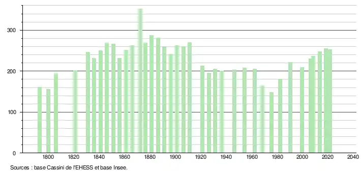 L'évolution du nombre d'habitants est connue à travers les recensements de la population effectués dans la commune depuis 1793. Pour les communes de moins de 10 000 habitants, une enquête de recensement portant sur toute la population est réalisée tous les cinq ans, les populations légales des années intermédiaires étant quant à elles estimées par interpolation ou extrapolation[27]. Pour la commune, le premier recensement exhaustif entrant dans le cadre du nouveau dispositif a été réalisé en 2008[28].
