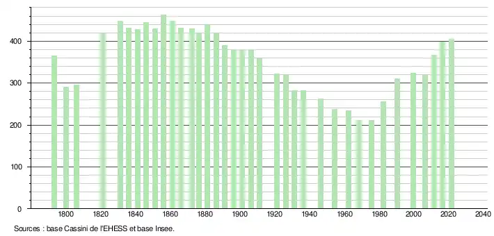 | L'évolution du nombre d'habitants est connue à travers les recensements de la population effectués dans la commune depuis 1793. Pour les communes de moins de 10 000 habitants, une enquête de recensement portant sur toute la population est réalisée tous les cinq ans, les populations légales des années intermédiaires étant quant à elles estimées par interpolation ou extrapolation[30]. Pour la commune, le premier recensement exhaustif entrant dans le cadre du nouveau dispositif a été réalisé en 2006[31]. En 2021, la commune comptait 405 habitants[Note 5], en augmentation de 4,11 % par rapport à 2015 (Lot : +0,89 %, France hors Mayotte : +1,84 %). |